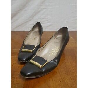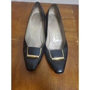 Brand: Salvatore Ferragamo Size: 6.5 B Color: Black Made In Italy Leather Pumps Gold Buckle Block Heel Almond Close Toe Ferragamo embossed on gold buckle Preowned: In Good Condition