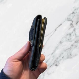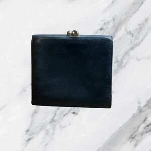 This authentic Salvatore Ferragamo bifold wallet features smooth black leather with the iconic grosgrain Vara bow and engraved gold-tone hardware. It’s a compact and timeless piece that still carries the elegance of Ferragamo’s Italian design. The exterior leather shows creasing, light scratches, and edge wear from age and use. The grosgrain ribbon has minor fraying and some hardened pieces, and the hardware shows some loss of shine. Inside, the kiss-lock coin pouch is clean, though the lining has faint fabric scuffing. The main interior shows general wear, with softened leather and fading to the gold-stamped logo. At this price, it’s a chance to own a classic Ferragamo at a fraction of retail.