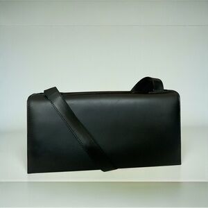 Sophisticated black leather handbag. Features interior zip pocket. Ideal for versatile use.
