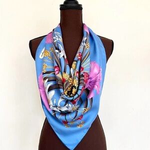Elegant silk scarf with striking floral design. Features blue, pink, and gold hues.
