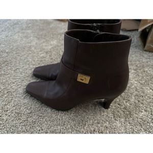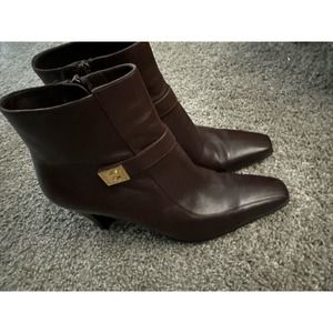 Salvatore Ferragamo Brown Leather Ankle Boots Womens 6.5 C Side Zip Heels Gold