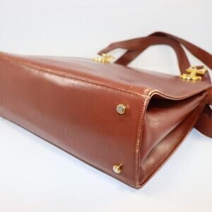 Vintage Salvatore Ferragamo structured shoulder bag in rich brown leather with signature gold-tone Gancini hardware. Features dual compartments, black leather interior, zip pocket with branded pull, and protective feet. Made in Italy. Shows gentle vintage wear: light scuffs, patina on hardware, and corner rubbing (see photos). A rare and classic piece with timeless style.