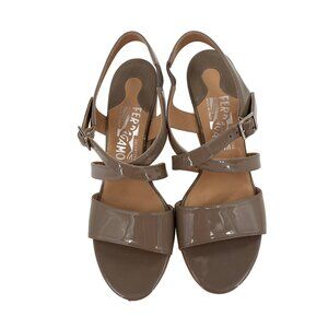 These stylish Salvatore Ferragamo sandals feature a brown patent leather upper and cork wedge heel, offering both elegance and a comfortable lift.
