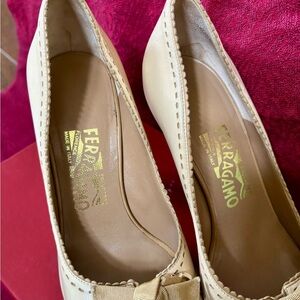 Great used condition!! These Salvatore Ferragamo heels showcase a refined cream hue with an intricate textured design and a stylish bow detail. The high peep-toe heels provide an elegant lift, ideal for making a statement at any special event.