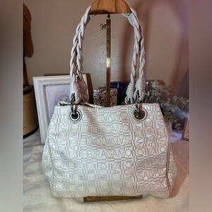Salvatore Ferragamo Cream/Off White Shoulder Bag Tote with signature print canvas exterior and thick braided handle. Silver hardware. Magnetic snap top closure. Two side snaps to expand to