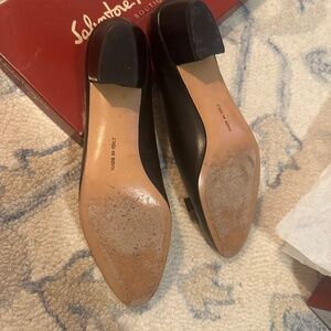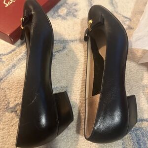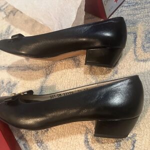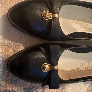 Great condition! In original box & papers. Vintage Salvatore Ferragamo black leather low heel shoes with black leather bows and gold charm. Size 7.5