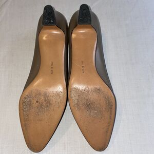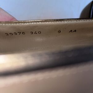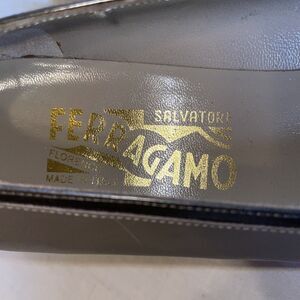 This womens khaki pair of Salvatore Ferragamo dress shoes has a few scuffs. Check out the pictures for full details! This item comes in a size 9 AA Thanks for looking at our item!