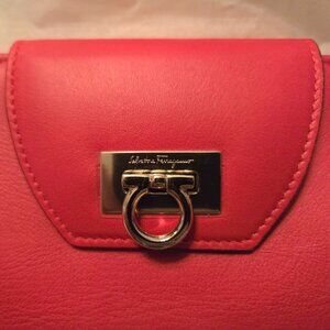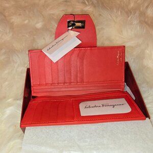 Salvatore Ferragamo Red Long Wallet, crafted from high-quality materials with iconic Gancini and Vara Ribbon accents. Features 14 card pockets, 1 coin case, and 1 bill compartment. Size: 9cm x 18.5cm x 2cm. A stylish and luxurious accessory, purchased from a Ferragamo store. Perfect for everyday use or collection.