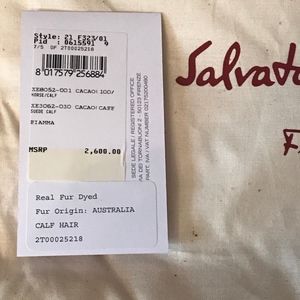 Authentic Ferragamo Cacao Brown Suede and Calf hair Fiamma handbag. Worn a couple of times, MINT condition. Style # 21F323. Detachable, adjustable shoulder strap 45", can be worn crossbody. Lined in silk. One outside pocket, 1 inside zippered pocket as well as 2 inside pockets for cellphone, etc. Gold hardware. Original dustbag & tags. Round top handles, flap front closure. Approx 14"W x 8"H x 4"D. Stand out handbag! Sold out style!! Leopard top style for 2025-2026!!!