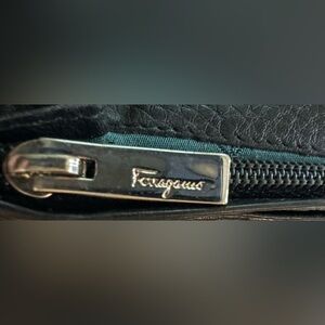 This buttery soft black calfskin wallet by the house of Salvatore Ferragamo features the iconic Ferragamo logo hardware which is on a hinge and functions as the lock securing the top flap closure in place.