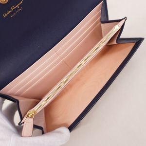 Salvatore Ferragamo Gancini Leather Long Wallet in Navy with Gold Hardware Wome