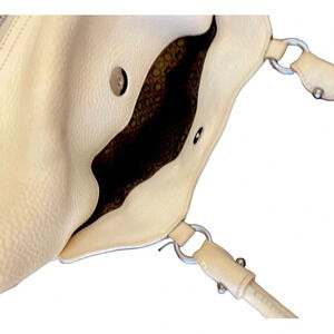 This classic Salvatore Ferragamo Marisa satchel is in PRE-LOVED condition (light use). It is made from elegant ivory cream leather and accented with silver-tone hardware and a jacquard inner lining. The bottom corners show light wear. There are a few faint marks on the exterior that are difficult to capture.