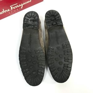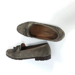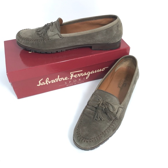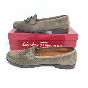 Vintage Salvatore Ferragamo Marta Calf Suede Loafer Taupe Gray Brown Low heel, light lug sole Leather laces & Tassel ties.