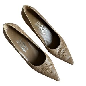 Salvatore Ferragamo Giusy Beige Lizard Print Leather Kitten Heel Pumps Size 8,5