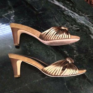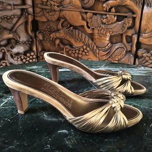 Gorgeous, Salvatore Ferragamo, made in Italy metallic leather with tan suede trim heels in size 7.