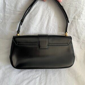 Authentic, polished black leather, DY-21 1780 Made in Italy. adjustable strap. Gold hardware. Pristine, very clean. Like new!