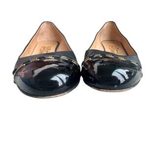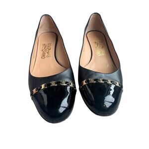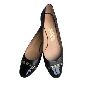 Salvatore Ferragamo Heels Vara Pim Chain Link Logo Black Leather Patent Toe Gold Chain 8.5AA