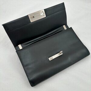 Elegant and timeless, this Salvatore Ferragamo shoulder bag is crafted from high-quality smooth black leather. Its minimalist design is enhanced by a silver-tone metal closure adorned with the iconic “Gancini” logo, the signature of the Ferragamo house. It features a slim, double strap, ideal for a refined shoulder carry.