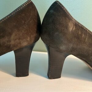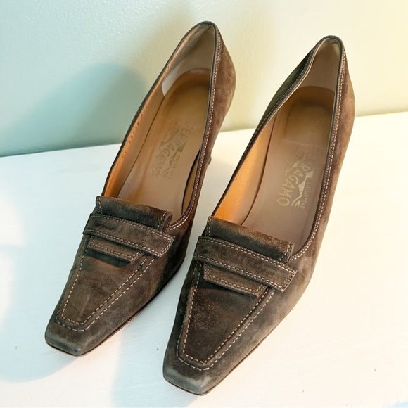 Salvatore Ferragamo Italian Olive Green Suede Heel, Loafer Style
