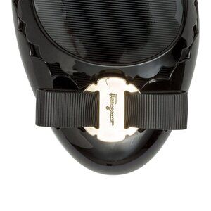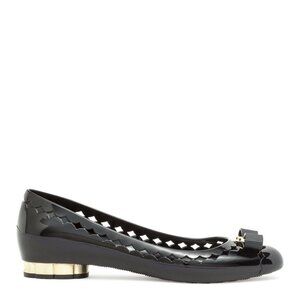 Black rubber flats from Ferragamo. The Jelly flats have a a gold flower heel and a signature 'Vara' bow.