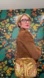 She’s made of nylon with leather trim, featuring a jungle leaf pattern in shades of green, brown, and yellow. The bag has a brown leather shoulder strap and gold-tone hardware, including a large ring attached to the side.