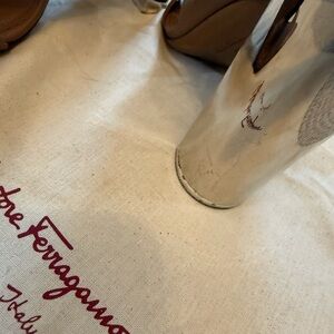 Salvatore Ferragamo sandals, designer block heels, mirrored heel sandals, luxury Italian shoes, brown leather heels, Ferragamo 7.5, event-ready heels, Ferragamo with dust bag, timeless luxury style