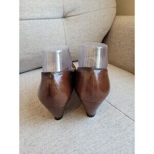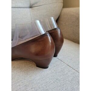 Stunning leather pumps by Salvatore Ferragamo. Brown leather with a two tone colorblock pattern and branded emblem on the toe box. Low heel. Great condition. Size is 10.5 AAAA (extra narrow)