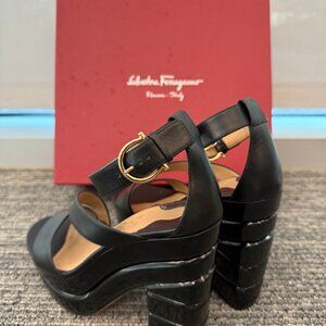Salvatore Ferragamo Lev Stacked Platform Sandal — worn once and in excellent, like-new condition. Features a modern stacked platform heel, signature Ferragamo craftsmanship, and premium leather construction for a sleek, elevated look. Super comfortable with a secure fit and stylish silhouette that pairs beautifully with both casual and dressy outfits. Minimal signs of wear from a single use. A gorgeous designer sandal that adds instant polish to any wardrobe!