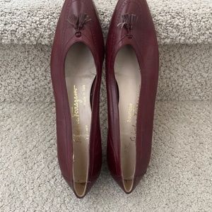 Maroon slip on loafers with stunning craftsmanship. Rounded toe with matching maroon stitching and cute tassels. Barely worn. Soles are in excellent condition. Small heel gives a little height. So classy!