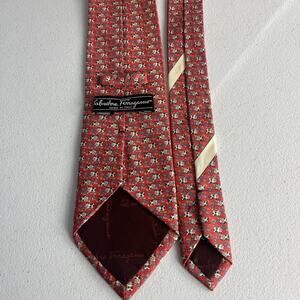 The Salvatore Ferragamo Men's Silk Necktie with a cow animal motif, made in Italy, exudes luxury and sophistication. The intricate design, featuring a small pattern and woven fabric, showcases the brand's craftsmanship and attention to detail. Perfect for individuals seeking a unique accessory that reflects a touch of travel, retro style, and a love for animals, this necktie is a standout piece in any gentleman's wardrobe.