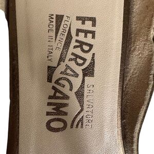 Elegant and timeless Salvatore Ferragamo flat sandals in a beautiful metallic bronze leather. Features a delicate strappy design, classic Ferragamo craftsmanship, and an adjustable ankle buckle for a secure, comfortable fit. Made in Italy with premium materials — chic, lightweight, and perfect for warm-weather dressing.