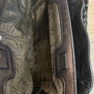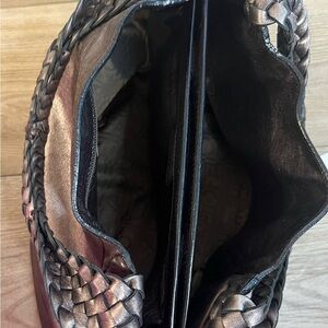 Salvatore Ferragamo handbag, Gancini leather, metallic bronze, bronze hardware, braided, all-over pattern, clasp purse, embossed logo