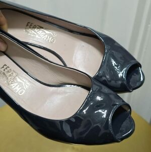 Salvatore Ferragamo Navy Blue Patent Peep-Toe Heels
