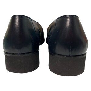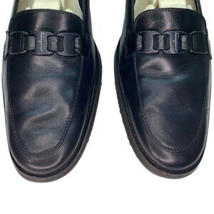 Elegant and functional, these Salvatore Ferragamo loafers feature smooth navy leather, a durable black rubber sole, and classic detailing ideal for professional settings.