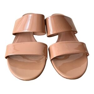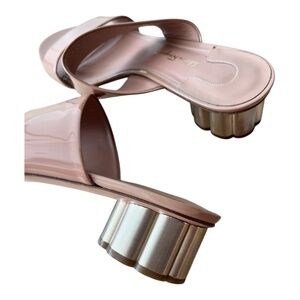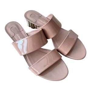 Italian style Salvatore Ferragamo Nude Patent Slide with Stacked Gold Chunky 2” Heel Size 10B. Gorgeous details and quality. Very good condition with some signs of wear.