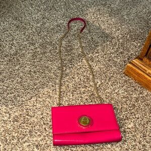 Vibrant pink leather bag with elegant gold chain. Features iconic gold emblem. Perfect for any occasion.