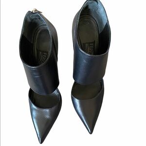 authentic Salvatore Ferragamo Raisha d'Orsay Pumps. These pointed-toe Salvatore Ferragamo booties reveal a peek of skin through the cutout vamp. Exposed heel zip. Covered stiletto heel and leather sole. Light used sign as shows in the photo. You get what you see. Leather: Calfskin. Made in Italy. MEASUREMENTS Heel: 3.5in / 90mm