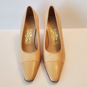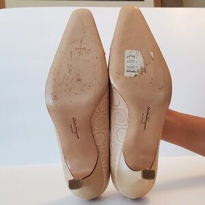 Very good used condition, Salvatore Ferragamo pointed toe beige Gancini pump. 3 inch heels, size 7C.