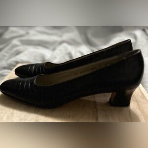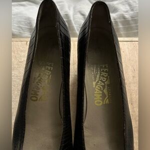 Salvatore Ferragamo Pump Black Croc Embossed Bow Women's Block Heels Size 9 VGUC
