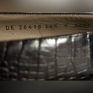 The Salvatore Ferragamo Pump is a women's shoe made of black croc-embossed leather with an almond toe shape and a low block heel. It features a slip-on closure and a leather lining and insole. The outsole is made of leather and rubber heels. The shoe is adorned with a bow and is suitable for various occasions such as travel, wedding, party, casual, christening, formal, workwear, and business. It is available in UK size 7 and US size 9. The shoe is made in Italy and can be worn in any season.