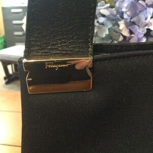 Beautiful black nylon Salvatore Ferragamo purse with leather straps. Two interior sections with logo lining. Golden hardware. Snap closure. Excellent condition both inside and out as seen in pictures. Serial number shown as well.