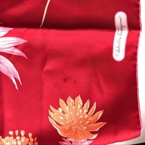 Women’s Salvatore Ferragamo Red Floral Large Square Silk Scarf. Colors: red, pink, orange, green, white. Excellent used condition: no snags, no rips, just minor stains (can be cleaned). Comes with: nothing else, no tag, no box. Offers welcome!