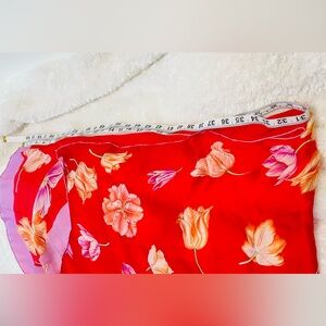 Elegant silk scarf with floral accents. Features bold red and soft pink hues.