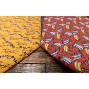 100% silk. Width is approx. 3 1/2". Leftmost tie is Robert Talbott, all other ties are Salvatore Ferragamo. Sold in lot only.