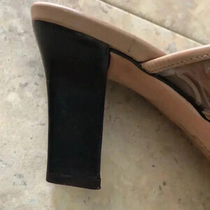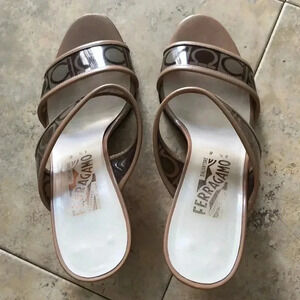 Tan and Beige leather high heeled sandals by Salvatore Ferragamo. Clear pvc straps with logo print. Made in Italy. Size 6.5. Heel height 3 inches. Wear on soles, exterior near toes, pvc and heels. Please refer to pictures and ask any questions before purchase.