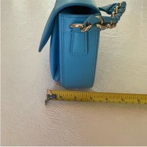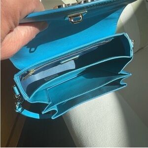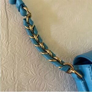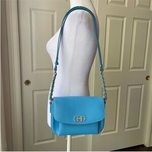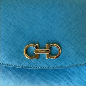 Salvatore Ferragamo “Sandrine” Small Saffiano Leather Adjustable Shoulder Bag. Like new! Turquoise blue saffiano leather with gold-tone hardware. Double Gancini logo detail. Classic Ferragamo chain link/braided leather detail on strap. Adjustable sliding shoulder strap from approximately 13” to 25” drop. Flap top with hidden push clasp. Interior has three open compartments and one zip pocket.