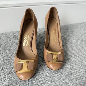 Salvatore Ferragamo Shoes Womens Size 7 Tan Vara Bow Peep Toe Block Heel 40083