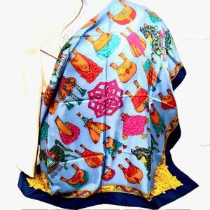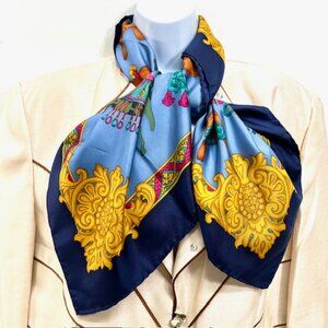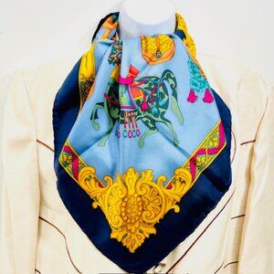 #42 Salvatore Ferragamo 100% Silk Scarf Satin 34"x34" features a beautiful carousel horse pattern in shades of dark blu/teal , gold, green, red orange and pink. Made from luxurious silk satin, this vintage designer accessory is perfect for year-round wear.