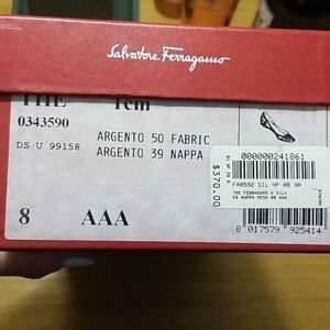 Authentic Salvatore Ferragamo silver mesh flats with cutout leather details. Made in Italy. Includes original box. Size 8 AAA. Some scuffs; see photos. Great used condition.