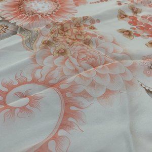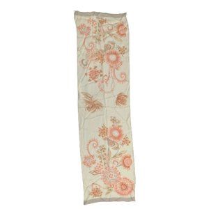 The Salvatore Ferragamo Sunflower Silk Scarf in Cream is crafted from a soft silk in Italy. This lightweight scarf features a rectangular shape and rolled edges. Its floral design includes flowing lines, and delicate flowers in shades of pink.